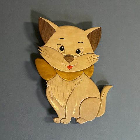 Tavla i trä med motiv av Hello Kitty. En stilren inredningsdetalj som passar både hem och arbetsmiljö. På baksidan finns en upphängningskrok.
