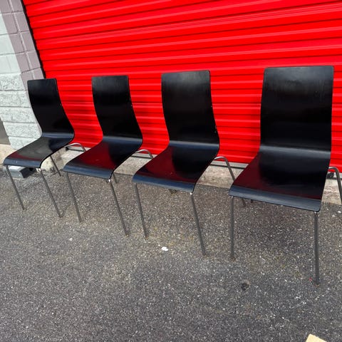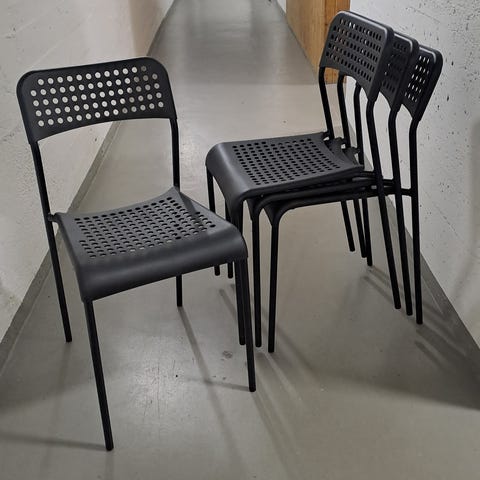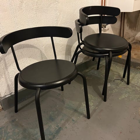 Säljer mina 4 svarta stiliga caféstolar som är väldigt lätta att torka av och som jag gillat väldigt mycket och haft svårt att göra mig av med, stått i förrådet i 2 år. Normalt slitage men tycker inte att man tänker på det, väldigt fina ändå. Säljes ihop och ej separat då jag önskar bli av med alla samtidigt. Normal sitthöjd. Först till kvarn!