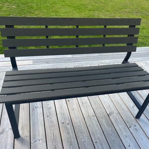 Trädgårdsbänk i trä och metall med dekorativ rygg