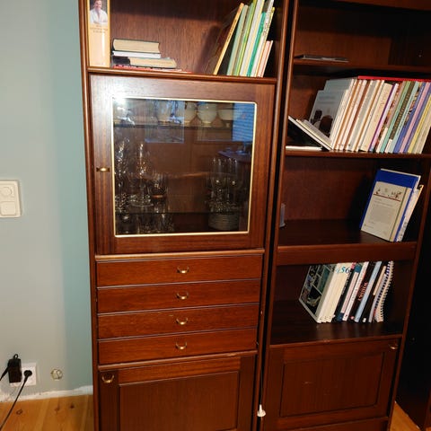 Bokhylla med två vitnindelar och skåp. Mycket fint skick men har ett skav på ett ställe.