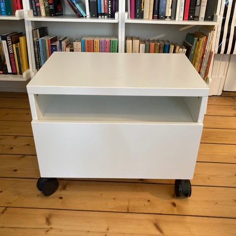 Vit, väl bevarad hurts eller nattduksbord med 4 lådor som går att låsa. Höjd 67 cm med hjul.