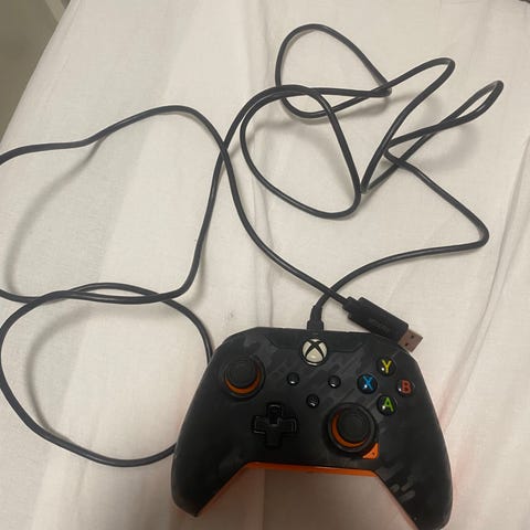 Microsoft Xbox trådlös handkontroll i vit färg. Handkontrollen har standardknappar och styrspakar för spelkonsoler. Den är trådlös och designad för Xbox-system.