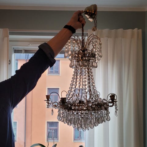 Fin och dekorativ takkrona i metall för 6 stearinljus typ Erik Höglund . Glassmycken, 4 upphängningsstavar.
