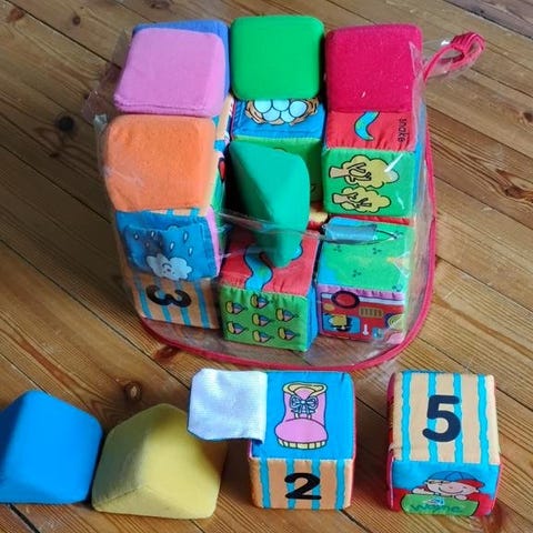 Se bild, ca 50 klossar i hink med lock. Locket har hål där klossarna passar. Varumärket är Eichhorn men det gick inte att skriva in.
