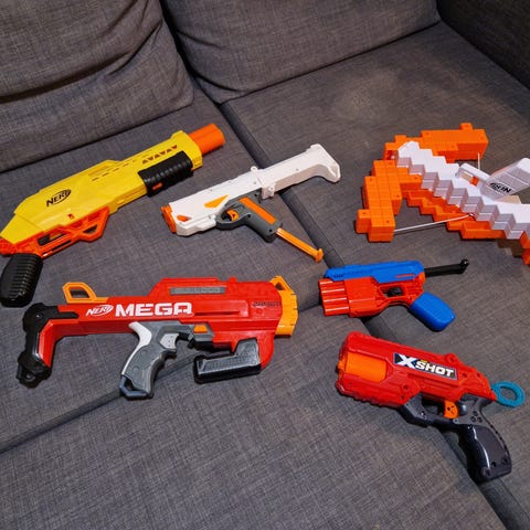 Nerf leksakspistoler i olika modeller och färger, inklusive orange, röd, grön och vit. Pistolerna är tillverkade i plast och är avsedda för barn. Varje modell har olika funktioner och utformning för lek och samling. En av dem är el och skjuter riktigt hårt. Om man köper alla så är det 800. Om man köper stycket så blir det ett annat pris