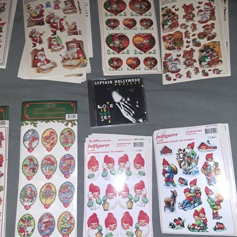Samt 7 rullar med klistermärken med julmotiv, rullarna innehåller totalt cirka 3480 klistermärken :) har använt någon etikett från 3 av rullarna och därav är antalet cirka 3480 totalt ( en rulle innehåller 500 klistermärken egentligen).