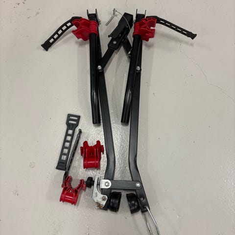 Biltema cykelställ för bakmontering, anpassad för att transportera upp till tre cyklar. Tillverkad i robust material med integrerade belysningsfunktioner. Passar för montering på bilens dragkrok (50mm kula, 13-polig) och har säkerhetsremmar för stabil fastsättning av cyklarna. Använd endast en ggn. Pris 1500:-.