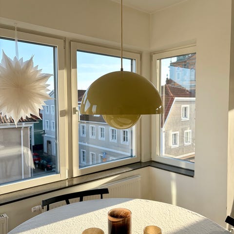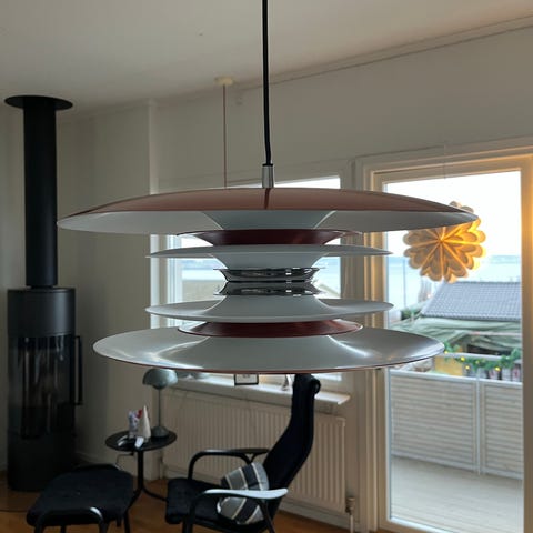 Säljer en äkta Flowerpot VP1 från Verner Panton, matt light grey. Finns något litet skav men inget som stör. Lång sladd. Diameter 23cm. Kan bytas mot Flos, Louis Poulsen, gubi eller Hay.