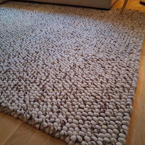 Mjuk, snygg och härlig matta, sparsamt använd, legat under ett bord. Lossat en tråd men den kan man nästa fast igen, se bild.