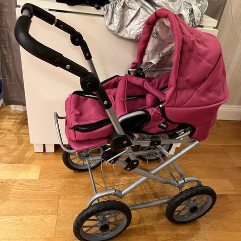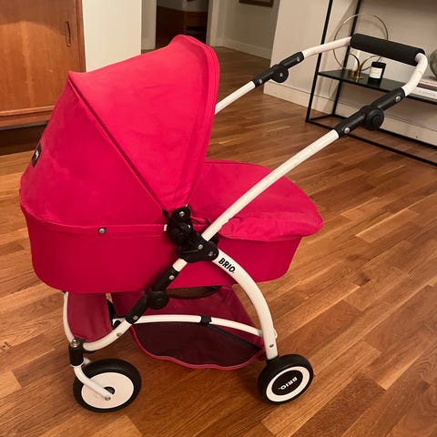 Fin röd dockvagn från Brio. Sittvagn med liggläge och "babyinsats". Ihopfällbar.