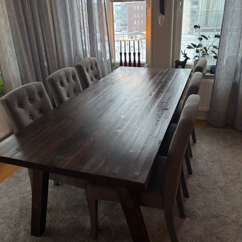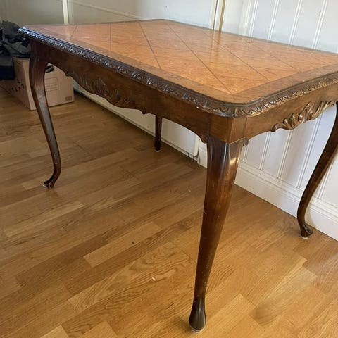 I använt men fint skick. Ett par mindre missfärgningar (se bilder) samt ett mycket litet hack i bordskanten.