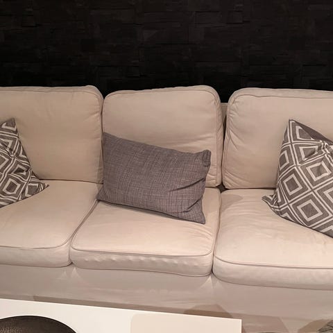 Ektorp 3-sits soffa med två klädslar, en grå och en röd (perfekt till julen 🎅)