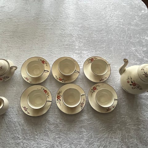 Servis är köpt i XXXLuc finns 18 delar i bra skick ,6 styck stora talrikar måt 26 x26 cm mellan tallrikar 6 styck måt 22x 22,5 cm 6 styck asiater 18x18 cm