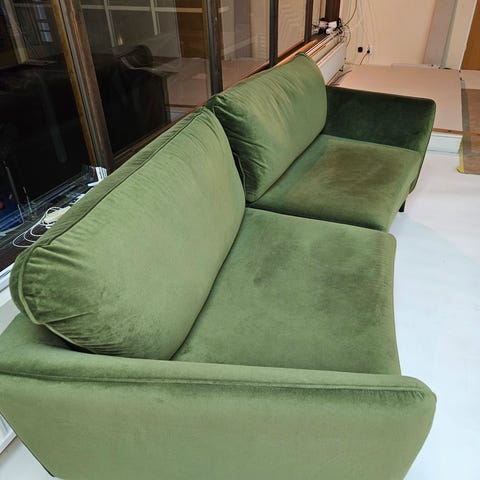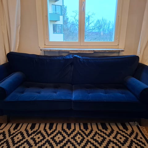 Blå soffa i sammet. Använd - med ändå bra skick. Sittdyna och kuddar med avtagbar klädsel (nytvättad)