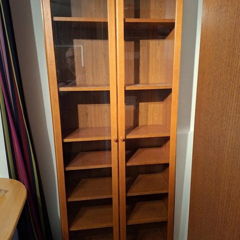 Säljer en stor och gedigen bokhylla/vitrinskåp i klassisk stil med vacker mörk träfinish och detaljer i mässing.