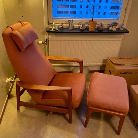 2 DUX-fåtöljer av modell Ingrid (låg rygg) i mycket fint skick. Originaltyg i blekrosa med grå detaljer. Otroligt sköna att sitta i.