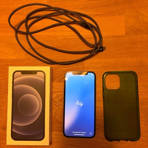 Svart ip 12 i nyskick, 128gb , batteri 100% , funkar som den ska och är olåst , skärmskydd, box och laddare . 2700