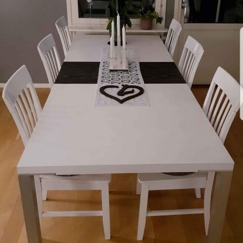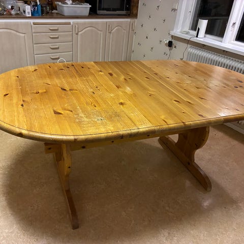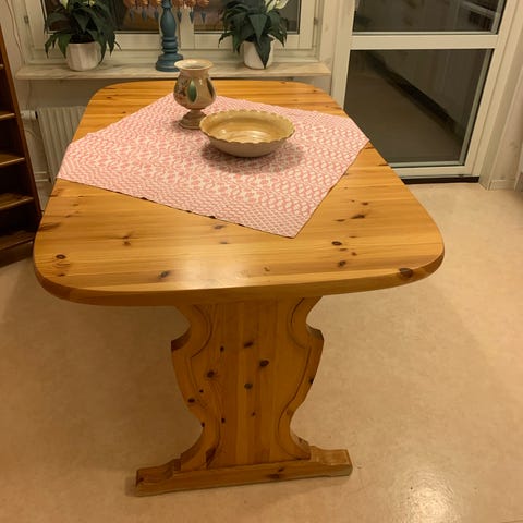 Massivt furubord. Måttbeställt av tillverkaren. 190 Långt, 1 meter brett, höjd omkring 77 cm, 4 cm tjock skiva.