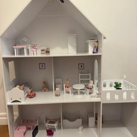 Ett charmigt dockhus med flera rum och detaljerad interiör. Tapetserade väggar och trappor mellan våningarna. Taket kan öppnas för enkel åtkomst. Gjort av en engelsk byggsats. I mycket fint skick, välgjort! Ingen el indragen, jag har använt batterilampor finns metallbrickor i taket för upphängning i några av rummen. Inga skador på tapeter eller golv. Hämtas i Västerås, inga trappor.