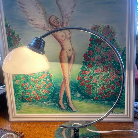 Art Deco bordslampa stål, trä och porslin enligt bilder.