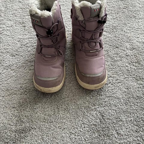 Viking vinterskor i storlek 33. Väldigt bra skick. Gore-Tex gör dem helt vattentäta och kardborren fungerar utan problem. Reflexdetaljer och rejäl sula. Färg: lila.