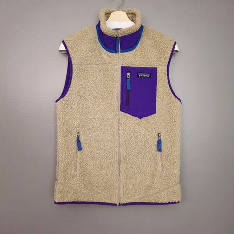 Grå Patagonia fleeceväst med dragkedja fram och två fickor. Västen har en hög krage och Patagonia loggan på vänster bröst.