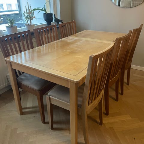Skick: Bordet i mycket gott skick. Några stolar har mindre repor (kosmetiska), inget som påverkar stabilitet eller funktion.