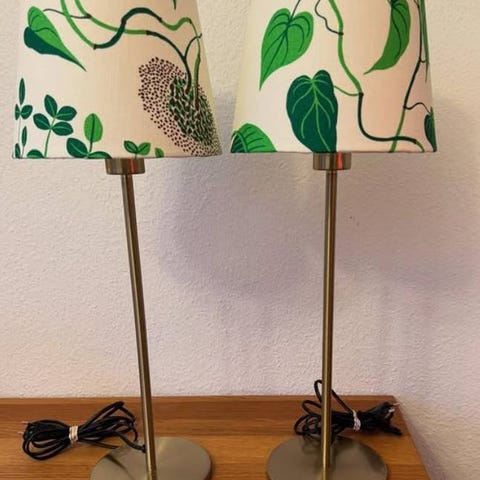 Underbart ringlande bladliknande ornamentering. Något sned. Fungerar/lyser, modern stickpropp som passar i nyare eluttag.