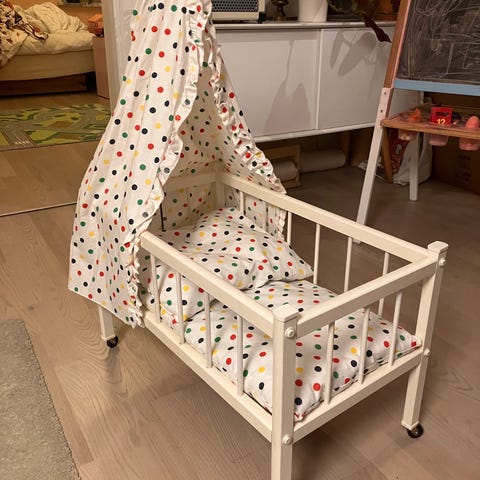 Säljer en docksäng i trä från JLY i rosa/lila färg. Stabil och gedigen modell som passar perfekt för lekar i barnrum.