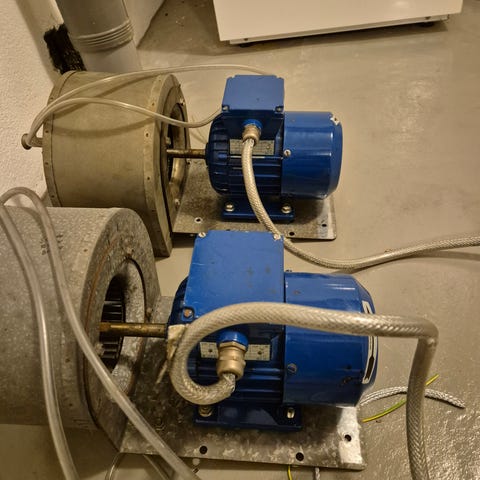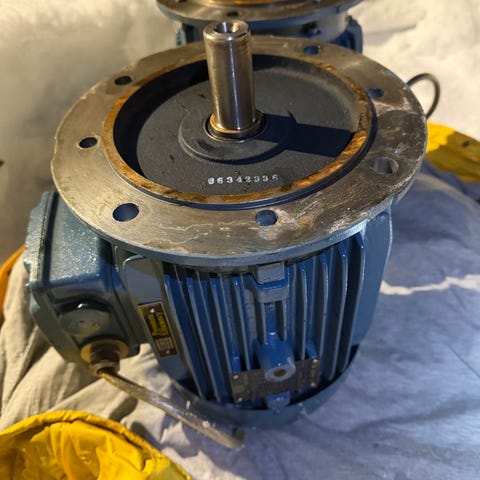 ABB MBT 112 M motor med 3-fas drift, effekt på 3,5 kW och varvtal på 1405/710 varv per minut. Motoren är märkt med IEC 34-1 standard och har en strömstyrka på 7,5/2,2 A. Vikt cirka 31 kg.