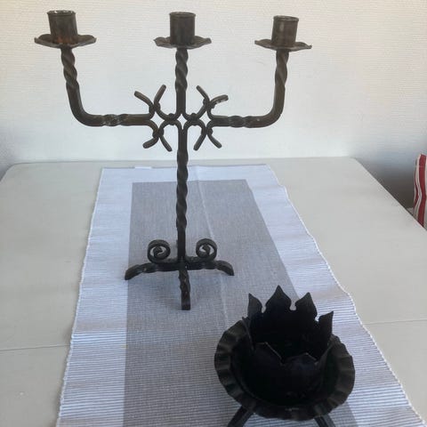 Ljusstake i smide och ljussläckare i smide. Ljusstaken har plats för 6 stycken ljus. Finns en skål i koppar i botten som kan dekoreras. Kan även användas utan skålen. 6 stycken ljusmanschetter i smide medföljer.