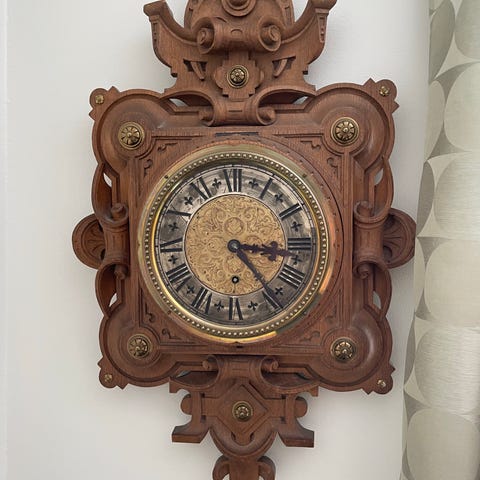 Antik väggklocka tillverkad i trä med dekorativ örn på toppen. Klockan har en pendel och en urtavla med romerska siffror. Passar för väggmontering och har en klassisk design som kan användas som tidmätare och dekorativ inredningsdetalj. Ett löv behöva limmas fast, klockan går och slår varje halvtimme men kan inte garantera att den går korrekt.
