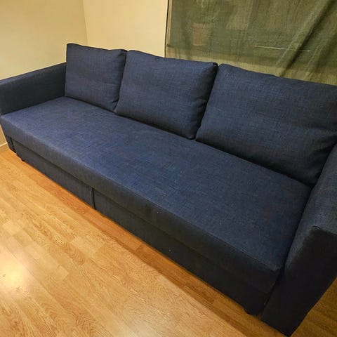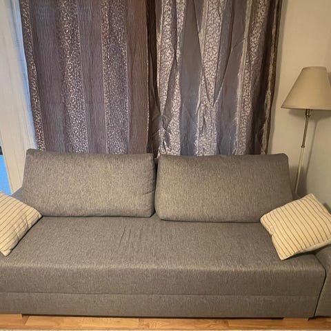 Grälviken. Bäddsoffa med 48 cm sittdjup och 43 cm sitthöjd. Bäddbredd 140 cm och bäddlängd 195 cm. Höjd inklusive ryggkuddar 89 cm. Totaldjup utbäddad är 140 cm. Säljes pga platsbrist. BVSA.