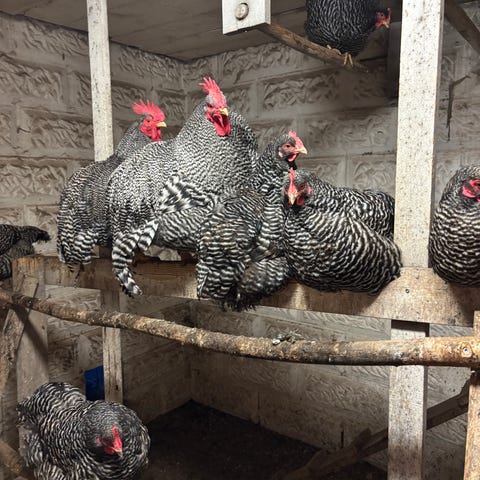 En grupp med 3 hönor + tupp. Hönorna har börjat lägga fina mörkbruna ägg. Just nu har de dock lite vinteruppehåll i äggläggandet.