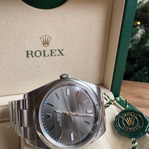 Säljer nu 1st Original Rolex Oyster Perpetual 34 i stål med lavender tavla.