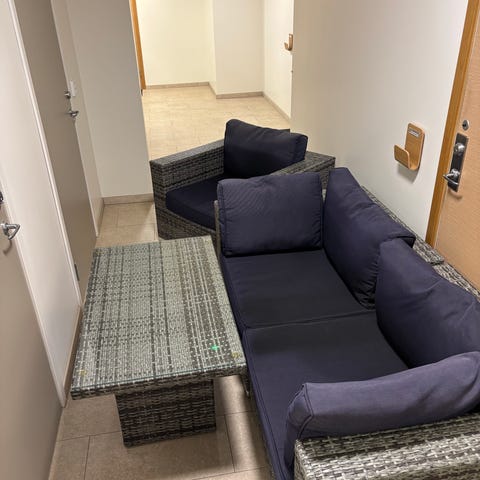 Utemöbelset bestående av en soffa, två fåtöljer och ett soffbord med glasskiva..