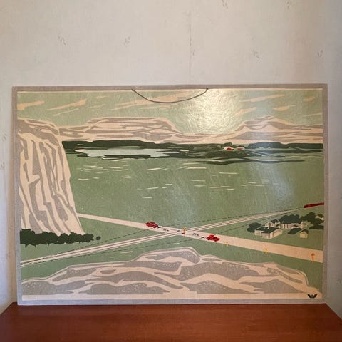 Oljemålning av O. Persson med motiv av båtar och stugor