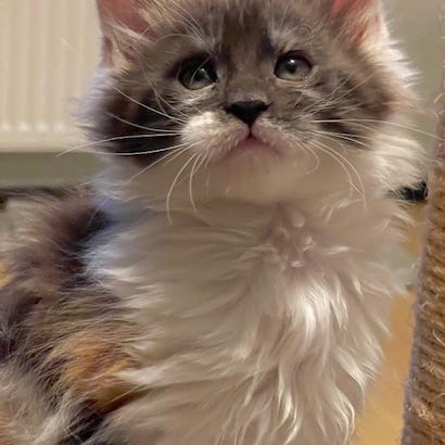 MODER: Maine Coon 6,2 kg med stamtavla med den läckra färgen Rödsmoke Harlekin m. vitt . Hennes päls är lättskött, långhårig och glansig som inte tovar sig. Supersocial knäkatt och älskar att ansikts-puffa.