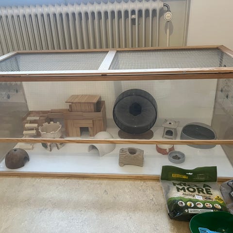 Terrarium som använts senast som hamsterboning och fortfarande är inrett som det. Inga sprickor eller fel, mycket bra skick. Alla hamstergrejerna följer med. Tre hus med flera våningar och ett stort hjul som låter väldigt lite. Observera att det inte är städat, det får köparen sörja för själv.