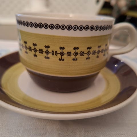 Fri frakt! Gustafsberg Festong Kaffekopp med fat vit med grönt lövmönster