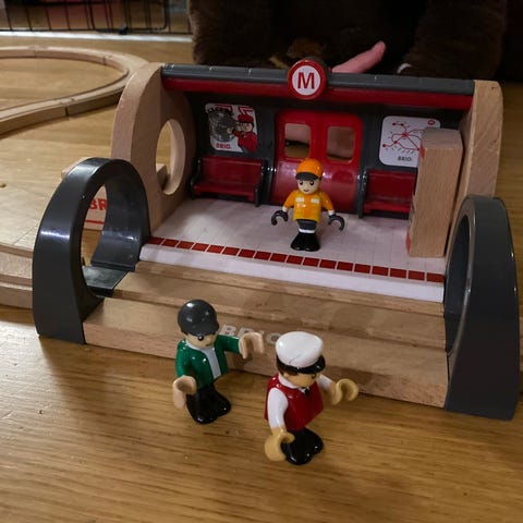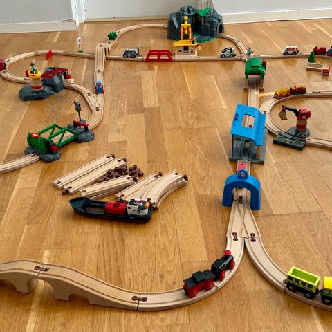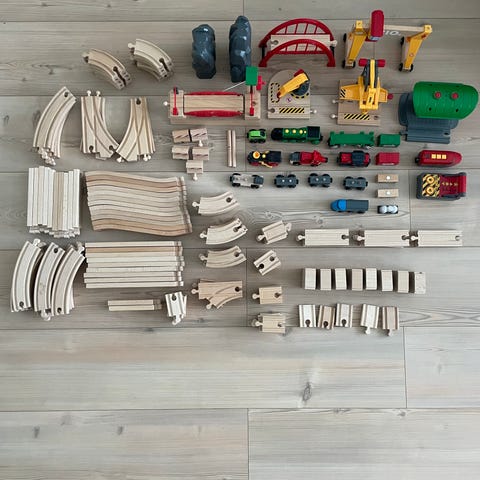 BRIO Tågbana i trä (Travel Switching Set), inkl. räls, tåg, bro, station och tillbehör, enligt bild 3. Utbyggnadsräls enligt bild 4. Extra tåg med tillbehör enligt bild 5.