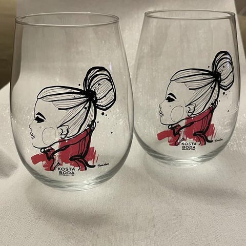 Kosta Boda glas med illustrerat motiv föreställande en kvinna. Glaset är tillverkat av klart glas och har en dekorativ design som kan användas för servering av drycker.