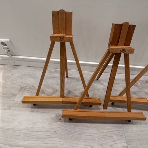 Trästaffli avsett för målning, med justerbara delar för att hålla olika storlekar på dukar. Passar för användning i hemmet eller ateljén.