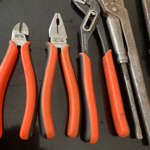 Verktygssats innehållande skruvmejslar, olika tänger, inklusive en kabelskotång, samt hylsor.