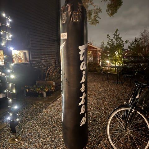 Fighter boxningssäck med stativ och tillhörande boxningshandskar. Utrustningen är avsedd för träning i boxning och kampsport. Den har multi - funktionellt tränings möjligheter, exempel pull ups med mm. Lite ostabil vid hårda slag.