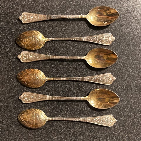 Set med 6 skedar med dekorativa handtag. Passar för servering av mindre rätter eller efterrätter.