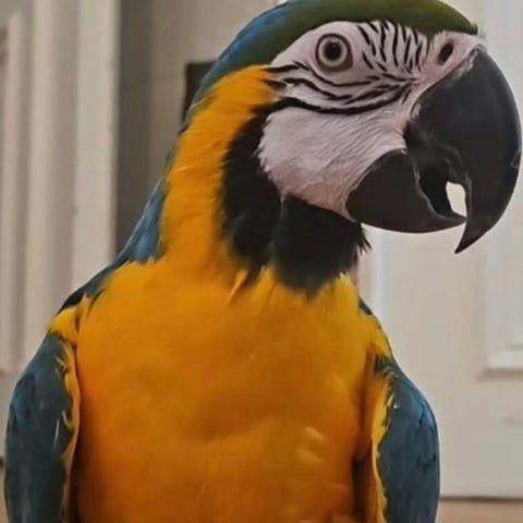 Nu söker denna underbara blågula ara (Ara ararauna) ett nytt och tryggt hem.