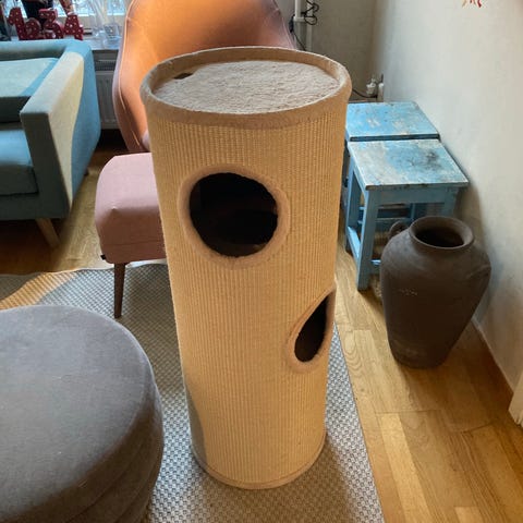 Kattklätterställning i beige färg med flera plattformar och en boll som hänger från en av nivåerna. Tillverkad i mjukt material som är lämpligt för kattens klösning och lek. Passar för inomhusbruk och ger katten möjlighet till klättring och aktivitet.