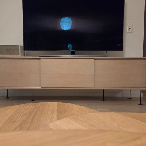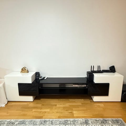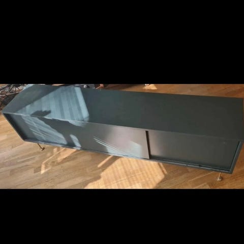 Snygg modern mörkgrön media bänk med slide funktion på dörrarna. Tre fack med hyllplan innanför. Mässingsben. Finns nån liten obetydlig repa.