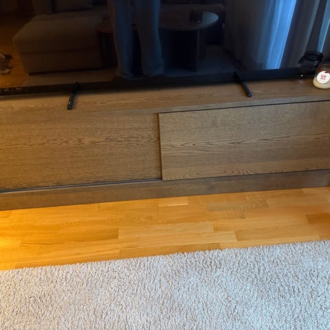 Dörrarna är högblanka. Skivan bak är utsågat mer än original för kablar men det synsju inte om den står mot väggen. Inga synliga skador på stomme eller dörrar.